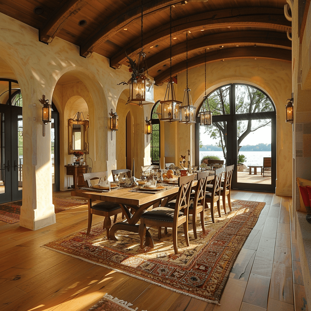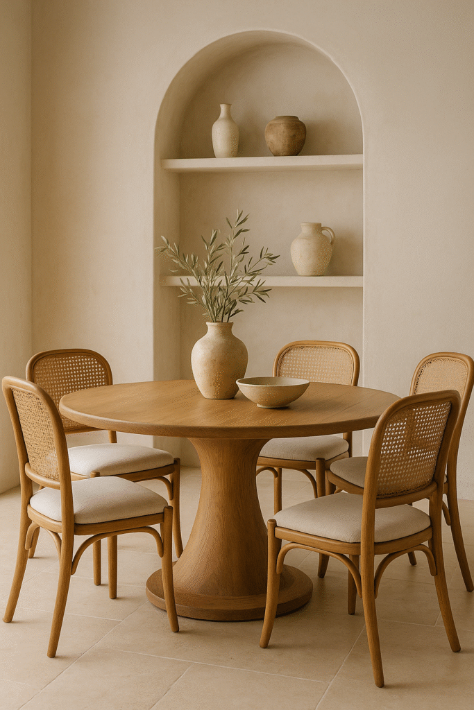 Modern Mediterranean dining room styling for 2026 moves away from sharp edges and leans heavily into soft curves. Rounded dining tables, arched niches, curved light fixtures, and sculptural chairs add visual fluidity.