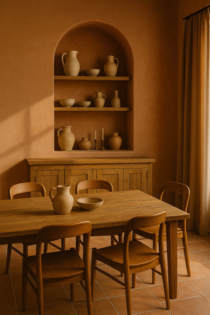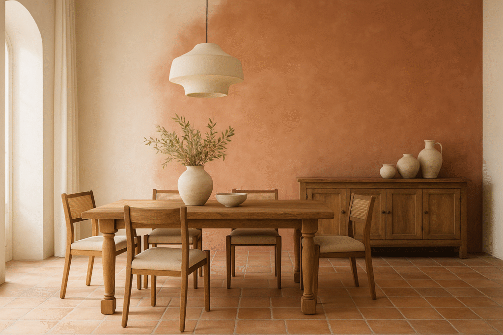 A modern update for 2026 is the reintroduction of sun-washed terracotta, not in small doses but as statement pieces, especially through tiled buffets, table centerpieces, and textured wall art. This revival brings warmth that pairs perfectly with the rest of the Modern Mediterranean dining room styling for 2026.