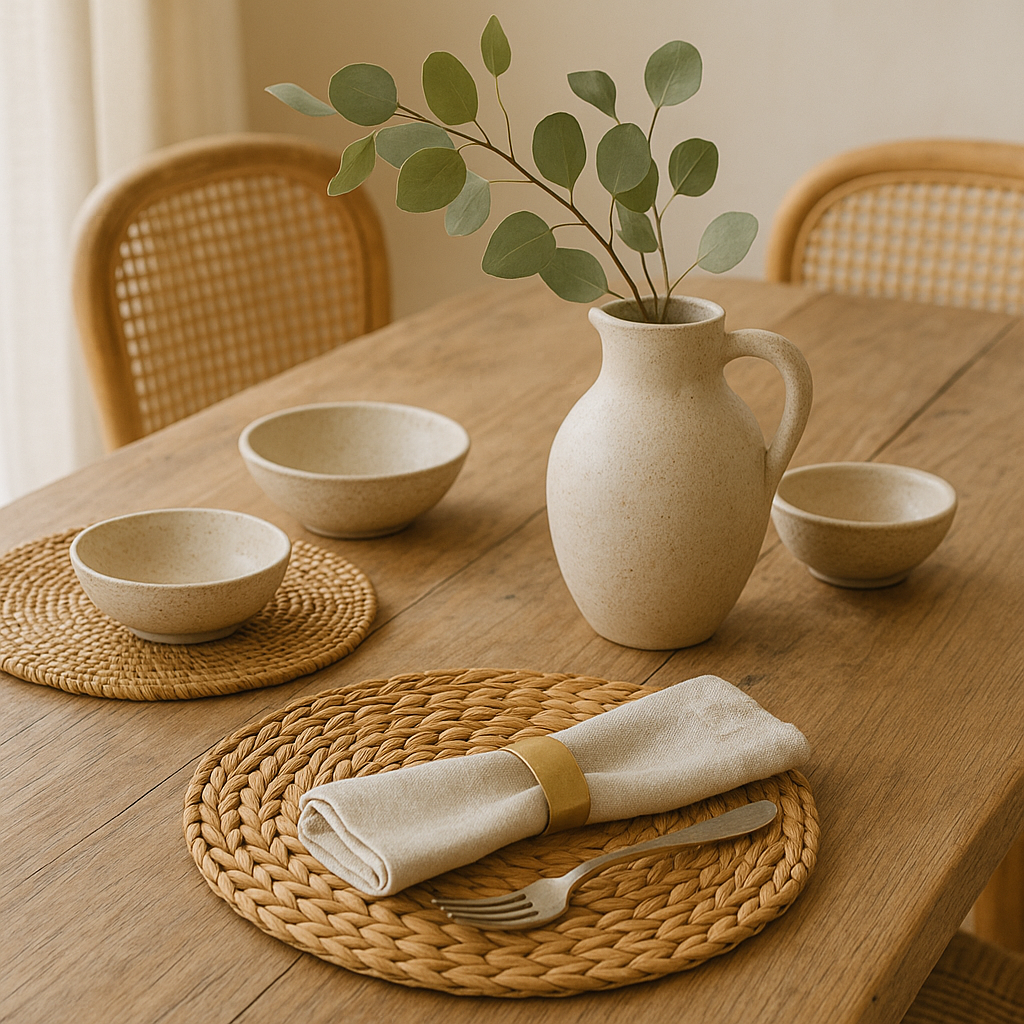 9: Close-up of woven Mediterranean table styling with ceramic pieces.