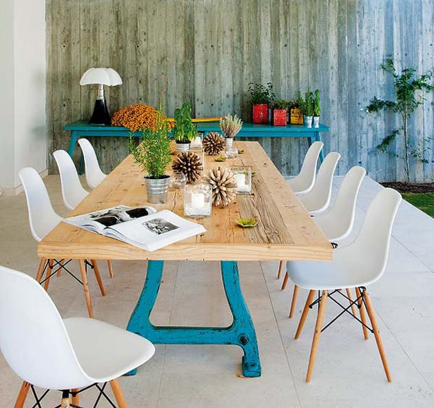 Pair the table with sleek chairs in linen, rattan, or curved molded wood to balance rustic warmth with modern refinement.
