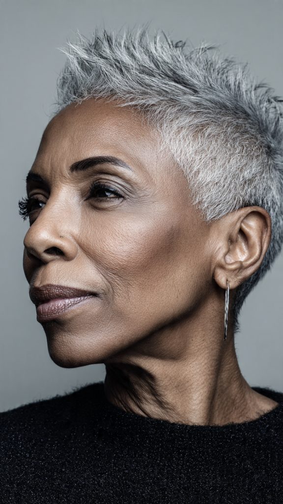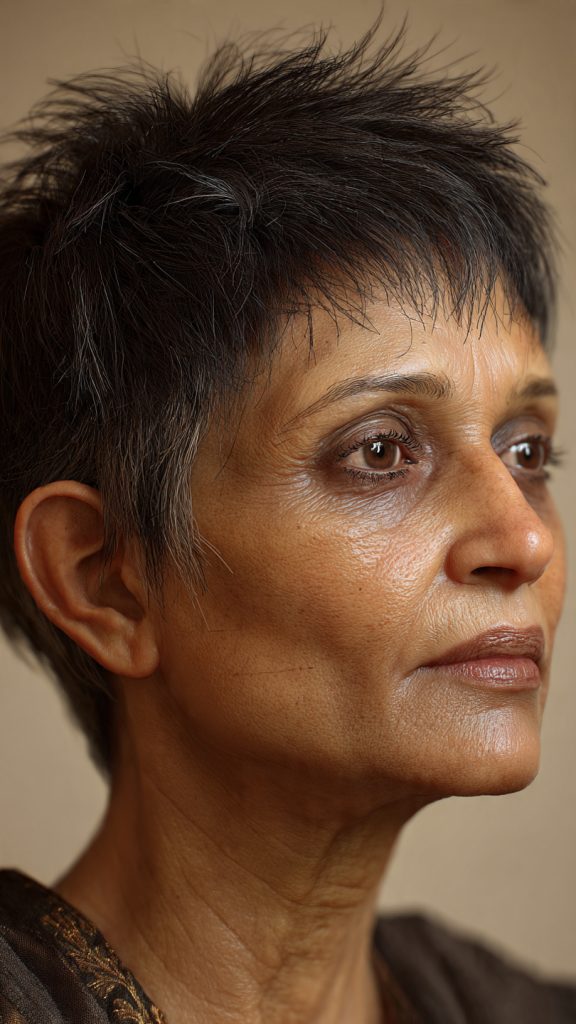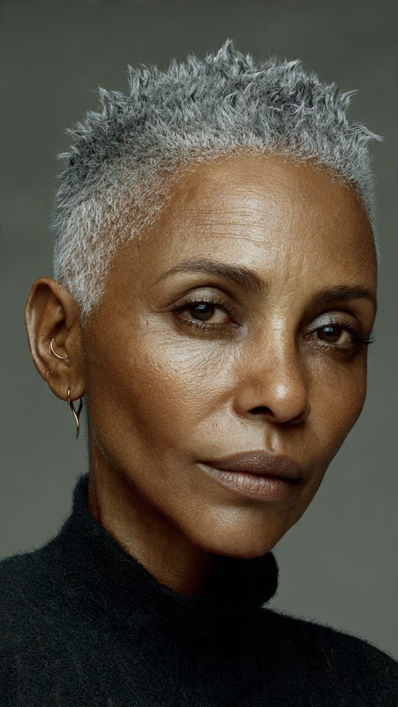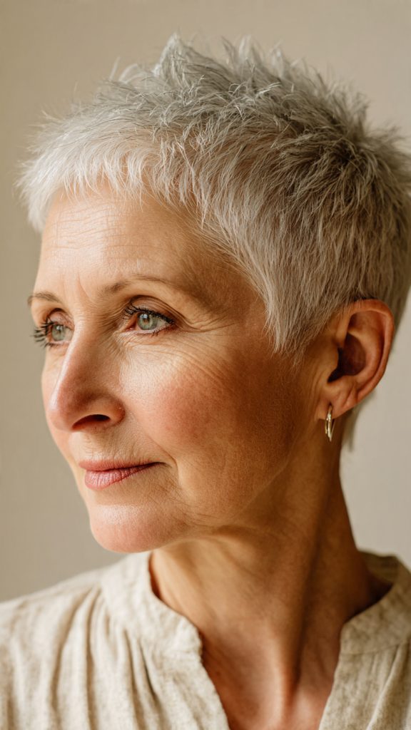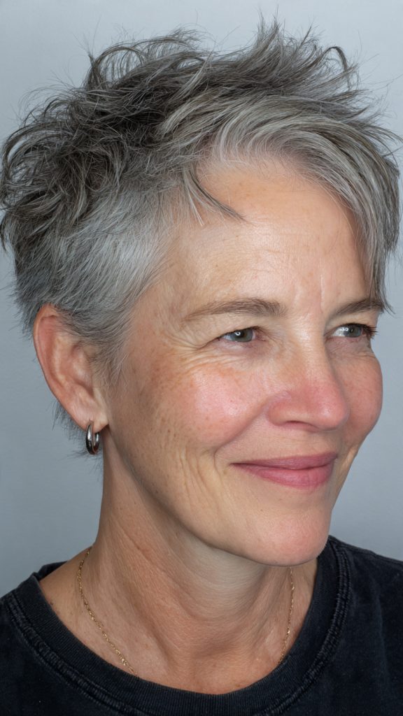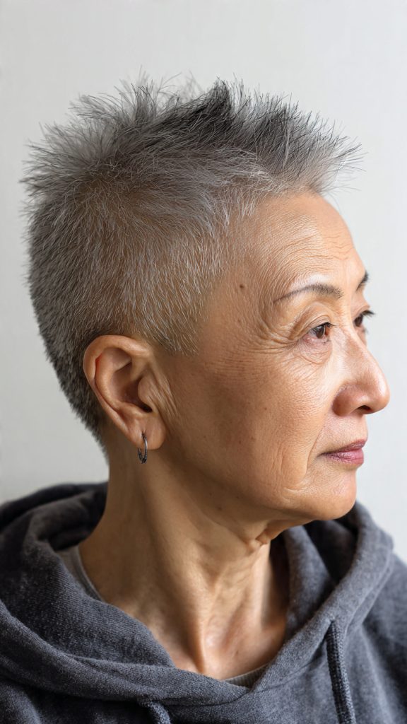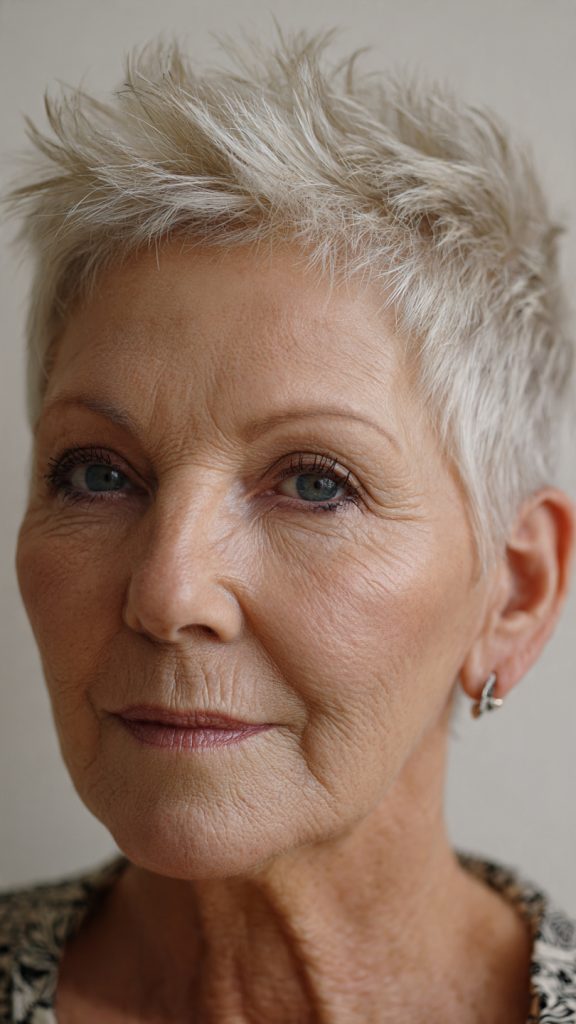 Beyond the obvious style benefits, spiky haircuts address several common age-related hair changes. As oestrogen levels drop, hair often becomes finer, thinner, and more brittle. Spiky styles create the illusion of density by adding height and separation at the roots. Grey and white hair tends to be coarser and more wiry; rather than fighting this texture, spiky cuts embrace it, turning what could be frizz into intentional edge. Additionally, lifting hair off the forehead and temples draws the eye upward, highlighting your eyes and cheekbones—features that only grow more beautiful with age.