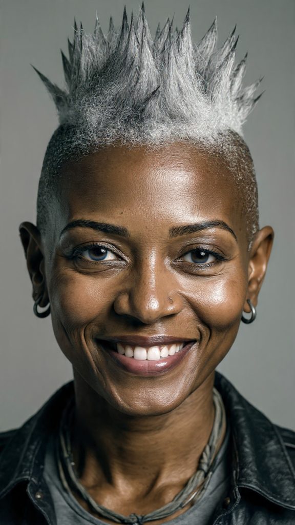 For the truly bold. This is a very short mohawk (2 inches tall at the center, fading to skin at the sides). The central strip is styled into firm, sharp spikes. When done with pure white or steel-grey hair, it looks avant-garde and incredibly powerful.