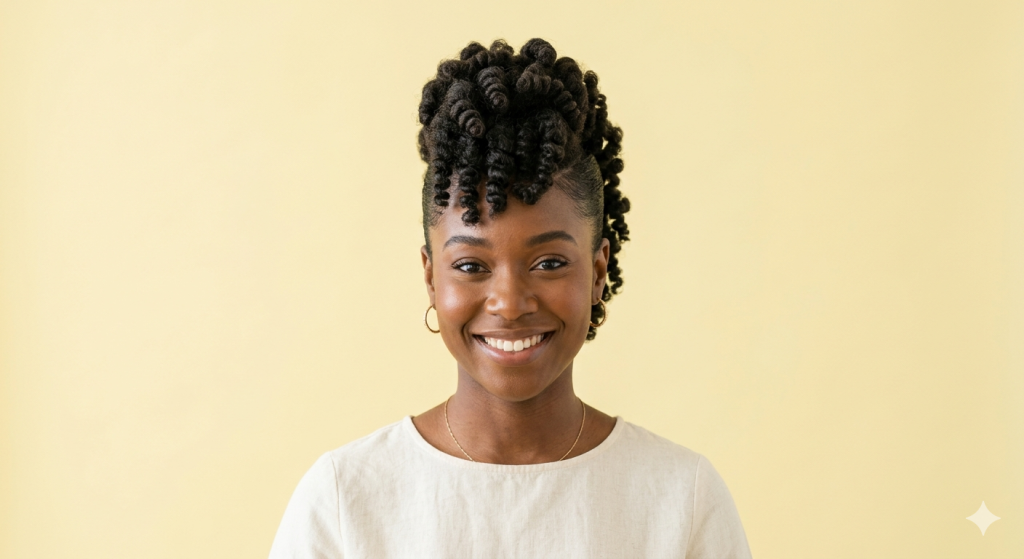 Sweep all curls to one side, then twist them vertically upward along the back of your head. Pin against the twist’s outer edge with U-shaped pins (not bobby pins). The natural coil texture hides the pins completely, giving the illusion of a seamless, polished roll.