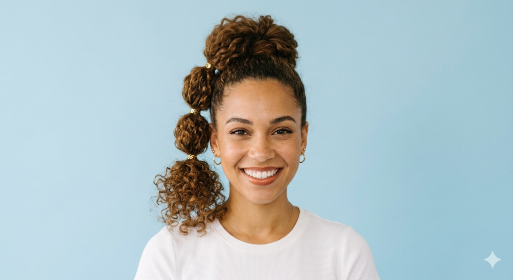 Make a high ponytail. Then, add elastic hair ties every 2–3 inches down the length of the ponytail. Gently pancake (pull apart) each segment between the ties to create round, bubble-like sections. Curly hair already has natural fullness, so this style looks instantly celebratory.