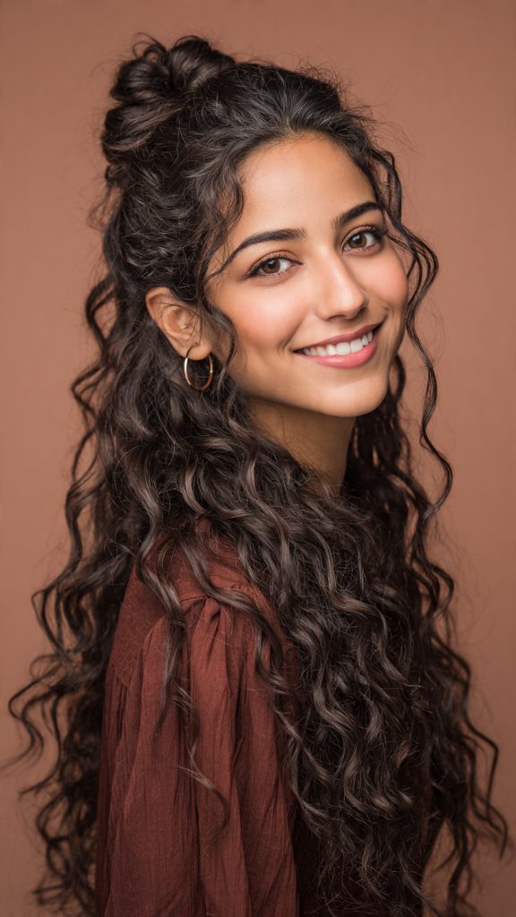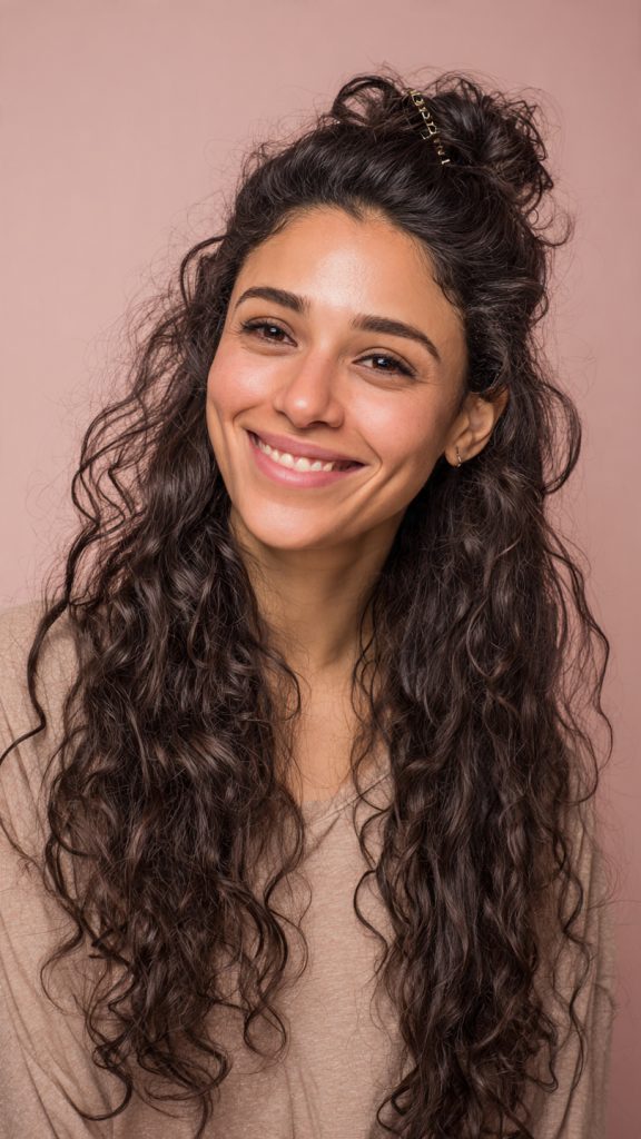This isn’t just a sleep-protection method—it’s a legitimate updo. Gather all your curls loosely at the very crown of your head and secure with a satin scrunchie. Let the ends fan out like a fountain. The height elongates the face, and the loose under-curls soften the look.