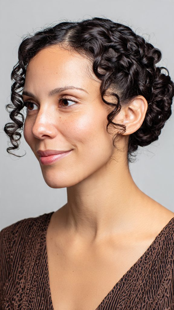 Gather curls into a low ponytail at the nape. Split the ponytail into two or three sections, coil each into a flat spiral, and pin them side by side. This creates a clustered, rose-like shape. It’s surprisingly secure and looks intricate despite taking only four minutes.