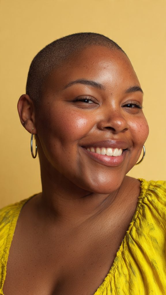 Yes, you can pull this off. A #2 or #3 guard all over removes the focus from “hair” and puts it entirely on your facial features and makeup. Curvy women with buzz cuts look like sculptures. Add large hoop earrings to frame the face.