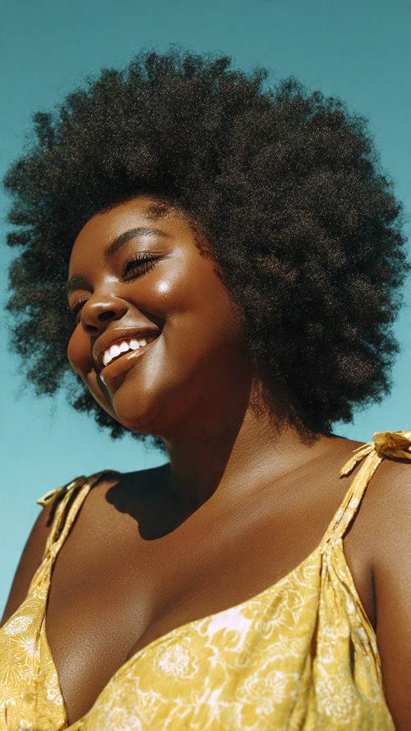 Don’t fight the shrinkage. A perfectly round, high-top Afro is a statement of confidence. The width of the hair balances the width of the body, creating a harmonious silhouette. Keep it hydrated with shea butter for a healthy shine.