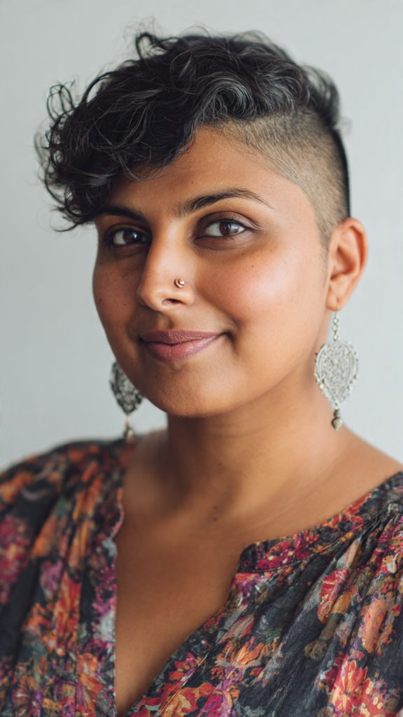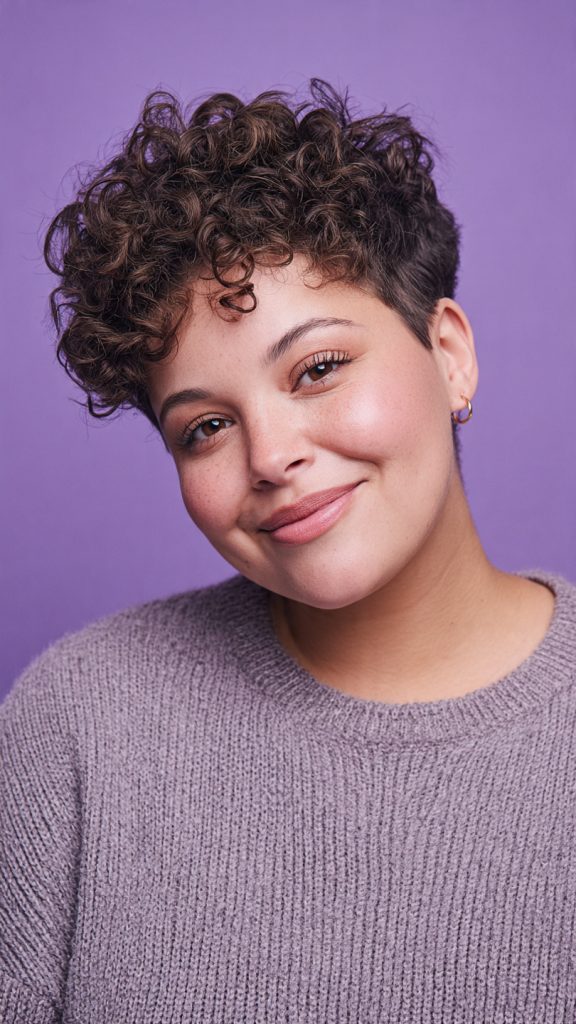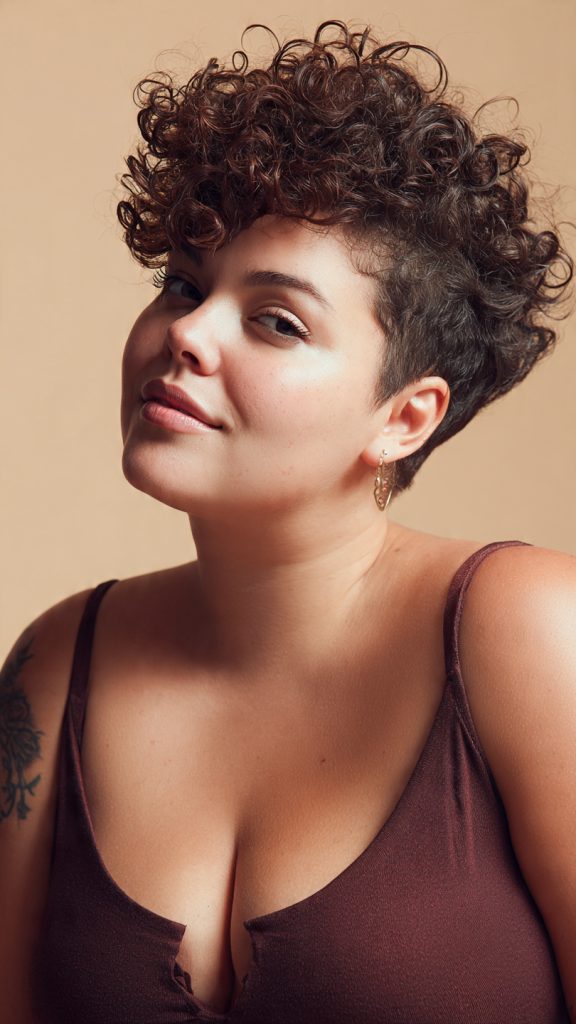 For thick, curly hair, ask for a pixie where the neckline is shaved or faded very tight, but the sides stay curly. This lifts the weight off the back of the neck (a common hot spot for plus size ladies) and keeps the silhouette light.