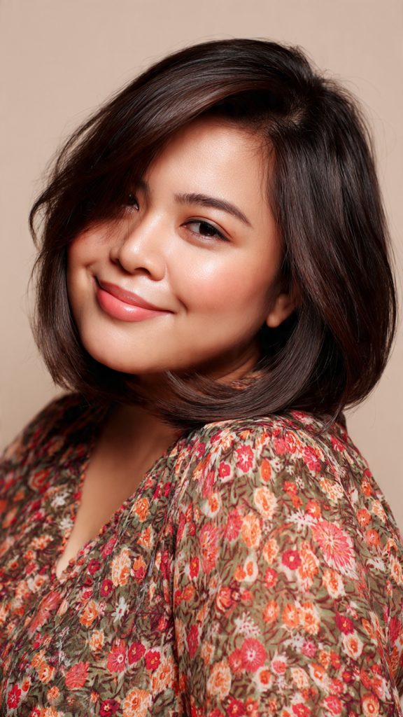 You don’t need to chop everything off. Take a classic lob (long bob) and add dramatic, deep side-swept bangs that swoop across the forehead. This diagonal line breaks up the roundness of the face instantly. It’s elegant and low-commitment.