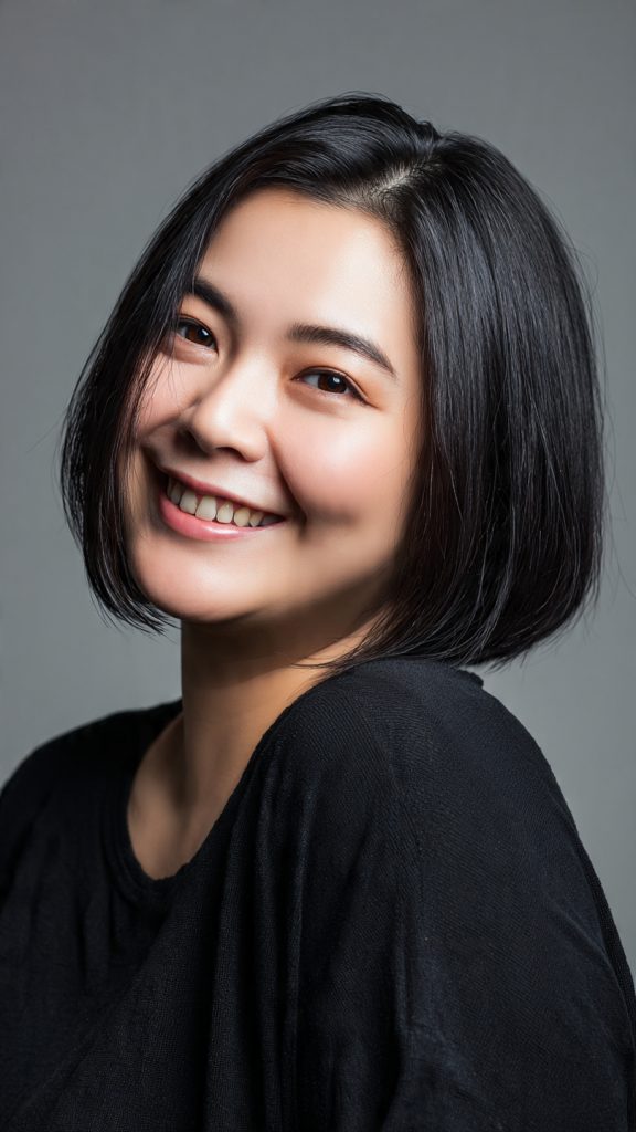 Chin-length, blunt, and often paired with micro-bangs or no bangs at all. This look works beautifully for plus-size women with strong bone structure. The blunt edge adds a graphic, chic vibe that distracts from the neck and focuses on the lips and eyes.