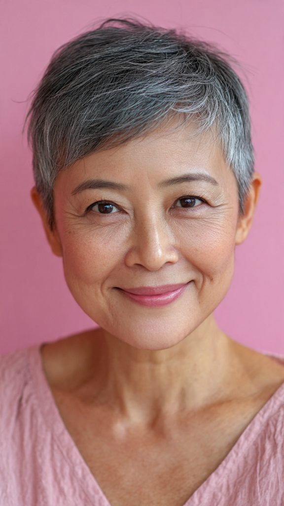 In your 50s and beyond, skin loses some elasticity, and facial volume can shift downward, which often makes a naturally round face appear fuller. A well-chosen haircut compensates for these changes by creating sharp, vertical or diagonal lines that counteract roundness. It also draws attention to your best features—your eyes, cheekbones, and smile—while minimizing areas you may feel less confident about, such as a softening jawline or double chin.